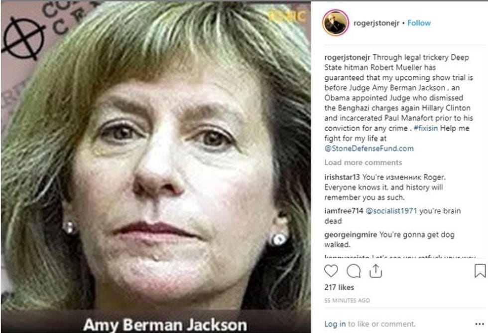 Gosh, we're starting to think Stone's friends are maybe not that nice after all! So, if these guys are acting as Stone's megaphone, can he be held responsible for their posts on his behalf? As of today, Perez, Engels, and Tarrio's Twitter accounts appear to be suspended. SAD! But before that happened, on Friday, Perez tweeted, "As much as the liberal media want to spin #RogerStoneArrested into evidence of #RussianCollusion, it only shows our innocence and their evil deeds, what a bunch of sore losers." And if these dipshits are acting as proxies for Stone and pushing his bullshit out under their own names on Instagram and Facebook, then perhaps Ol' Roger's time in the hoosegow will be coming soon. Because if he's found to have violated the gag order, Judge Jackson promised to LOCK HER UP Roger Stone for good.