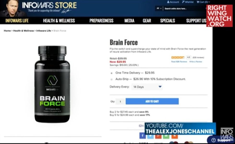 Yup. The "Hillary's gonna kill me" stuff was all a lead-in to an endorsement for Alex Jones's shitty nutritional supplement scam pills,which promise to help you "Flip the switch and supercharge your state of mind," because Brain Force is "the next generation of neural activation." Only $29.95 for 30 capsules! (Daily dosage: 2 capsules a day) Better get you some Brain Force capsules so YOU won't be caught off guard by the Clinton Death Machine! [Machete and General Electric M134 Minigunsold separately]