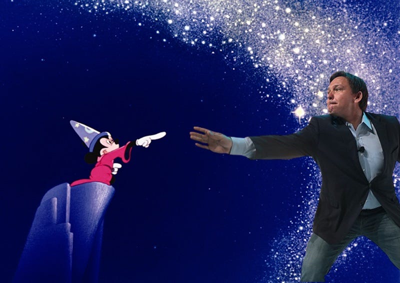 He didn't stop to think that, of all right-wing corporations, Disney may be most dependent on Creative Class labor; which is disproportionately liberal and, dare I say, gay. He didn't consider that Disney may have more staff lawyers than the state of Florida; and better ones, at that. Nor did he consider that Disney has nearly 100 years of beloved characters and among the best name-recognition and brand value on the planet; as opposed to...um...Ron DeSantos and some sneering Florida white-bread thugs?
