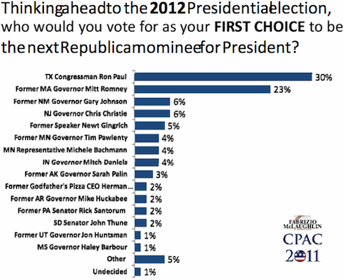 The Wonkette team made it through two of CPAC's three days before a combination of disgust and alcohol poisoning finally sent us running, so we're a little late tonight with the thrilling news (?) that Doctor Ron Paul won the wingnut straw poll! Ron Paul is going to be president again! So awesome. He won last year, too. This means Ron Paul is now a two-term president and will have to "stand down for socialism" in 2012. Who said winning was easy? Also, he got less than a third of the vote, which proves nothing more than 1) Ron Paul always gets his loyalists to vote in the straw poll, and B) The Republican "conservatives" are just a confused & jumbled mess today. They really don't know what to do. Romney is still Mormon and Liberal, Sarah Palin is still some halfwit teevee grifter with a never-ending series of tawdry scandals, Donald Trump is a dumb muppet clown, etc. (Why is Donald Trump even mentioned? Oh right, because he decided to show up. Doesn't take much to create "star power" at CPAC.)