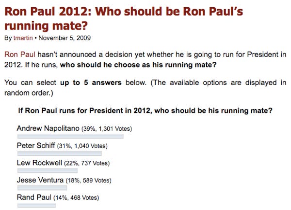 Oh do make sure to help out Dr. Ron Paul by voting in his who should be my Vice President when I am President poll! Look at all the completely random former novelty politicians and immediate family members there are to choose from. [ RonPaul via Hit & Run ]