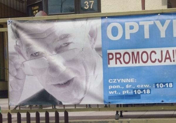 Wonkette's secret Eastern European money-laundering operative "Adam" sends this photo and writes: "Hey, I was in Poland last week traveling and I came across this ad. For real, is that the Doc Paul? Is he creating a freedom revolution FOR POLISH EYEGLASSES!!????" The answer is no. That is clearly Magneto, maybe.