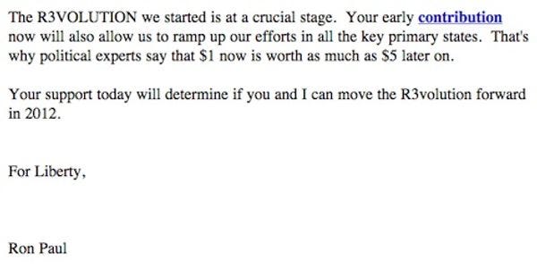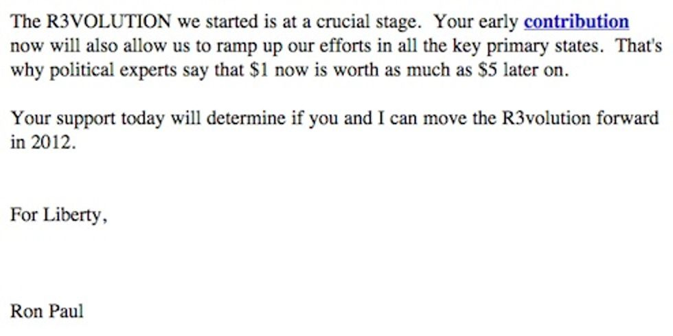 What is this "R3VOLUTION" thing he is talking about? Is this hippie language? Does Ron Paul think we are hippies? We are not hippies, but probably all hippies and high school seniors everywhere will now vote for Ron Paul. Ron Paul/ John Lennon 2012! [ LA Times]