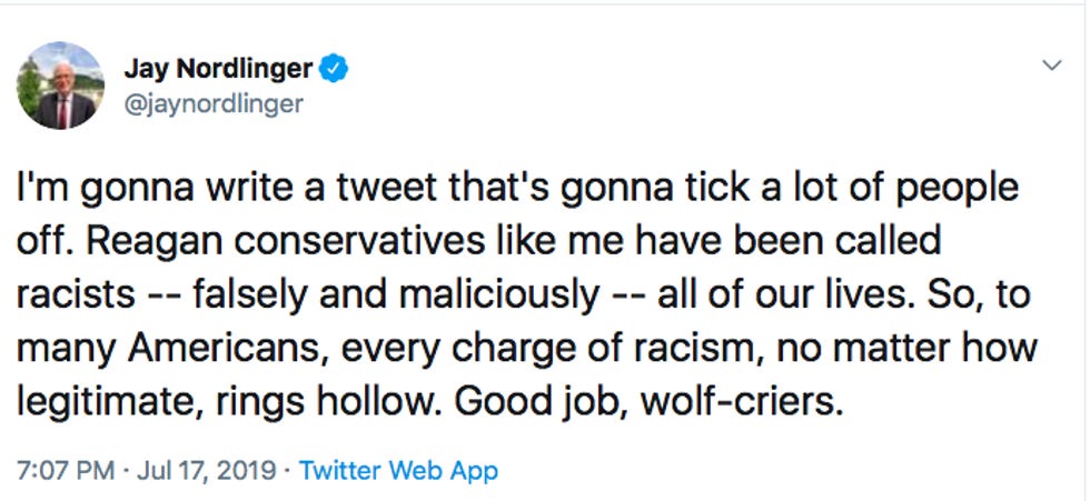 The current Republican president is a foaming-at-the-mouth white supremacist who likes to raise lynch mobs against sitting congresswomen of color. As potentially life-threatening as this all is for Ilhan Omar, Alexandria Ocasio-Cortez, Ayanna Pressley (apparently not related to Elvis), and Rashida Tlaib, it's a downright mild inconvenience for other Republicans who don't like people thinking they're racist or even racist-adjacent. Can't we think about their feelings for once?