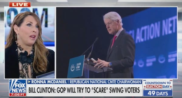 However, Clinton's absolutely right that striking fear in the hearts of white folks is Republicans' primary persuasion tactic, and Tuesday, Republican National Committee chair and perpetual lying machine Ronna McDaniel proved his point.