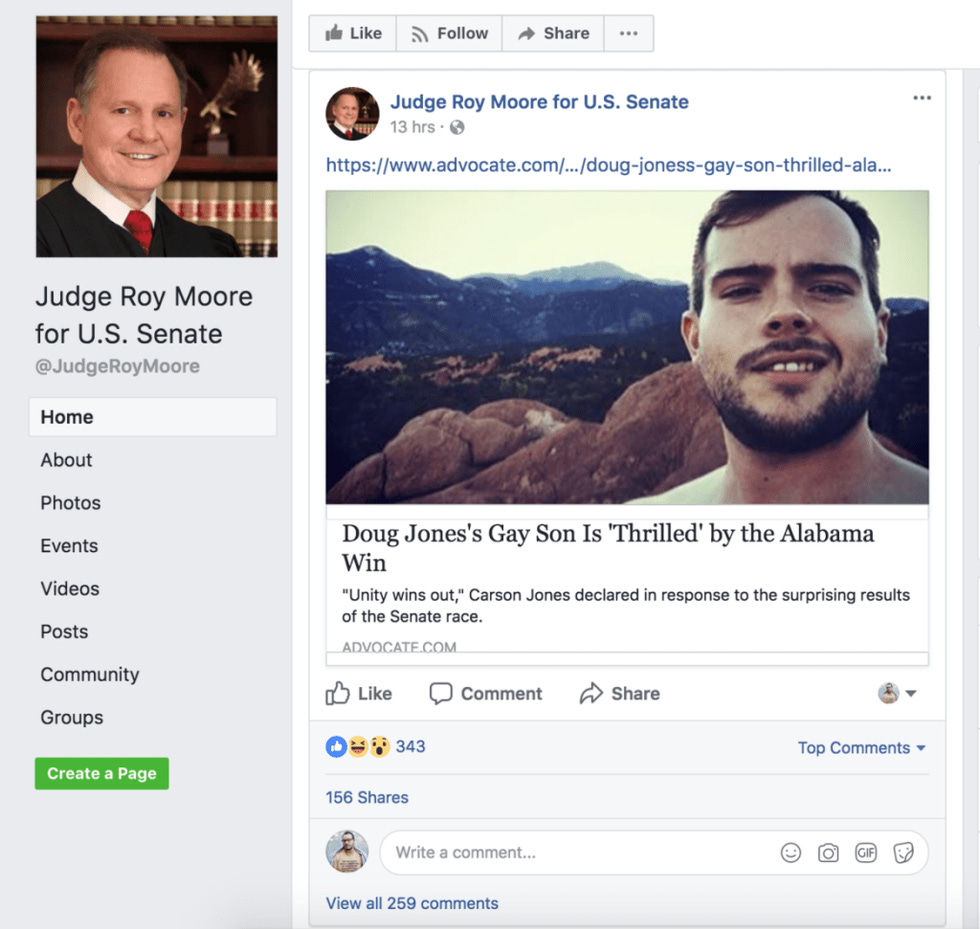 And Think Progress notes that Moore's been doing some Facebooking lately, just to make sure Alabama voters are aware of the really important issues going on. There was a link about a guy who TOTALLY DID voter frauds, except for how Alabama's Republican secretary of State looked into it, and found out the guy did not do voter frauds. There was another link from trusted journalism website WorldNetDaily about how Doug Jones only "won" because of the Muslim Marxist Black Latinos, which is obviously illegal, because God told Roy Moore in a wet dream one time that brown people are yuck.