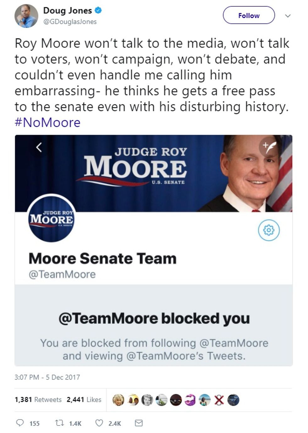 What a jerk. There should be a law requiring candidates to debate, dammit -- and not just on Twitter. (Did we mention yet that Roy Moore refuses to?) And maybe some basic standards of human decency, which in Moore's case he has not got.