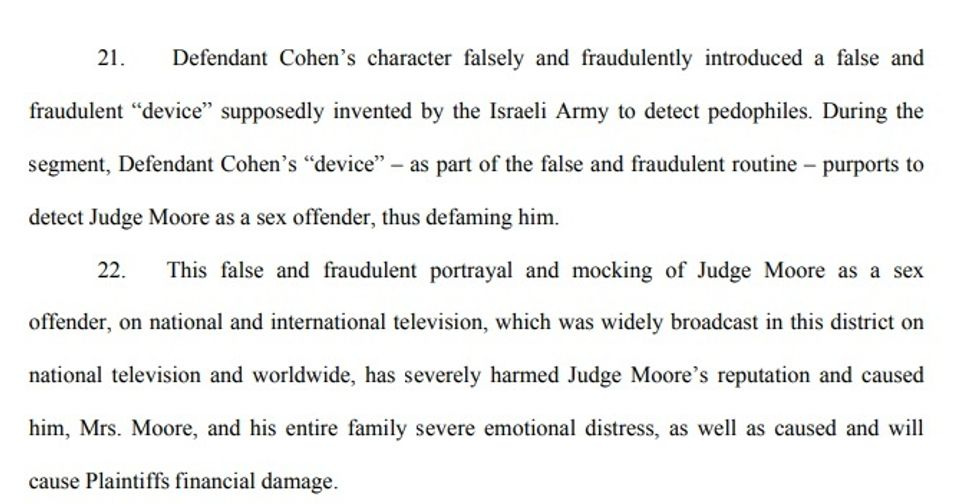 Disgraced old Bible-humping has-been Roy Moore is suing comedian Sacha Baron Cohen, Showtime, and Showtime's parent company CBS for $95 million because Cohen pretended to be an Israeli TV host and tricked Moore into thinking he would receive a Major Award for being a friend of Israel. In fact, Cohen played a very mean prank on Moore and called him a pedophile, which apparently is worth $95 million if you're an idiot. The complaint in the case became available yesterday, and we fear Moore may have to sue himself for defamation too, because boy, it really makes him look foolish.