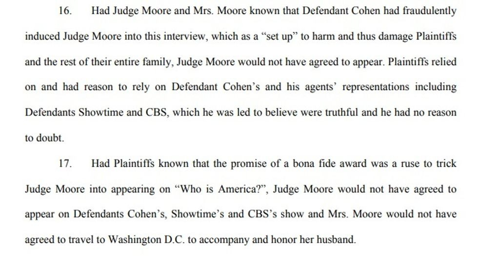 Defendant Cohen and his agents including the Defendants Showtime and CBS set up scenarios where Defendant Cohen, while in character, falsely and fraudulently induces unsuspecting victims, such as Judge Moore to be interviewed under dishonest, unethical, illegal and false pretenses, for his works. Defendant Cohen and his agents then set these unsuspecting victims up for ridicule and to severely humiliate them on film to promote his works and to generate large financial returns for himself [...]