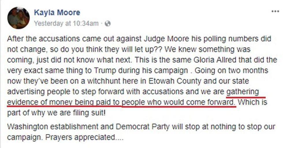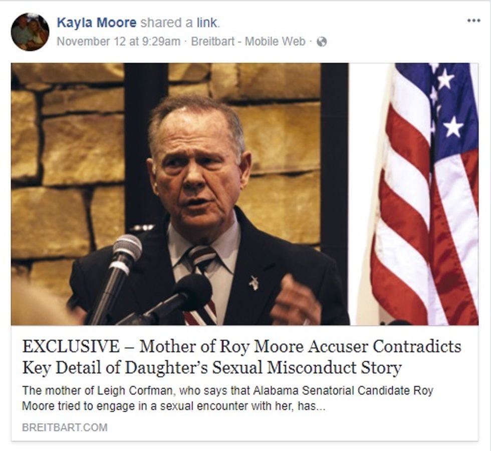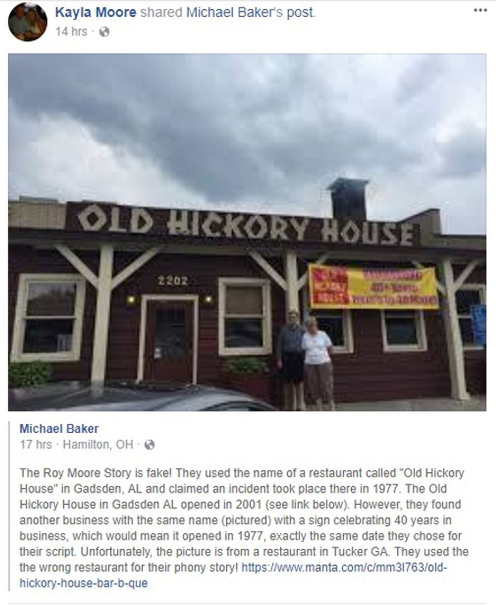We can certainly understand the impulse to want to go with anything that might make the Washington Post's very well-sourced allegations against her husband go away. Now, in the attempt to discredit Roy Moore's fifth accuser, Kayla Moore is now just posting any crap the wingnuttophere tosses onto the interwebs, like a dubious "forensic expert" post from the Stupidest Man On the Internet and some random Facebook guy's contention that the restaurant where Mr. Moore allegedly tried to rape Beverly Young Nelson just plain never existed in 1977.