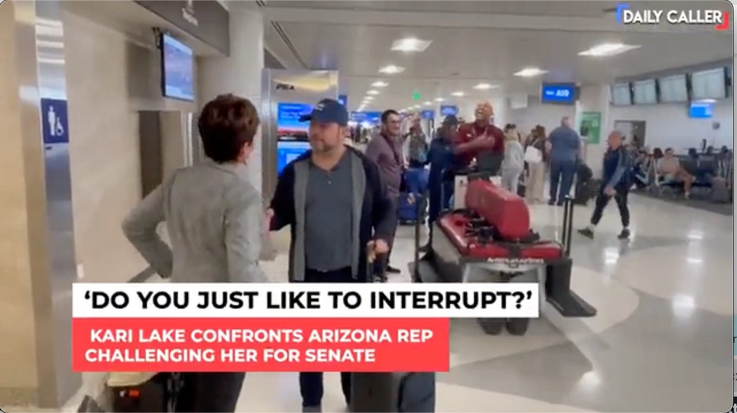 Once they’d landed, Lake bum-rushed her future opponent at the airport. She was sort of like the MAGA Michael Moore — fully mic’ed and with a camera crew and everything.