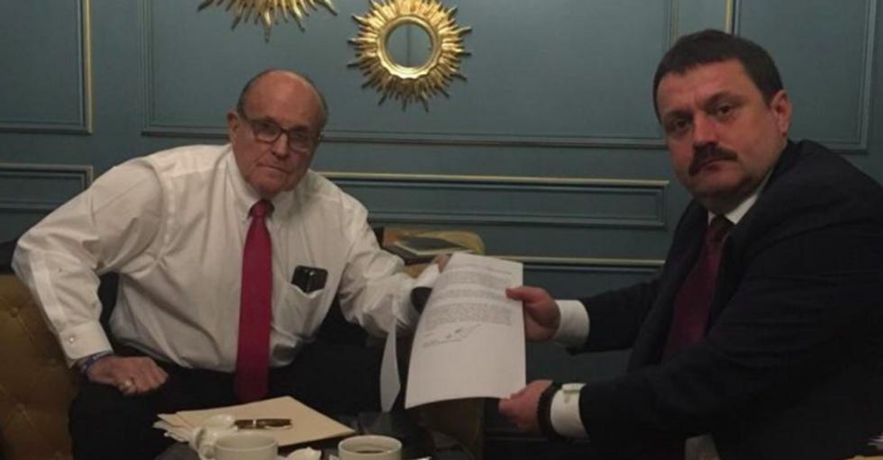 The New York Times reports that Rudy met Tuesday with Yuriy Lutsenko, the former chief prosecutor who slimed Marie Yovanovitch and then immediately retracted his story. Then Wednesday it was on to Kyiv to meet with Viktor Shokin, the corrupt prosecutor pushed out by the IMF, EU, and the entire US government who conveniently now blames Joe Biden, and Konstiantyn Kulyk, a prosecutor fired last month who's been working with Lev Parnas, journalist John Solomon, and Nunes aide Derek Harvey on the Biden smear. And if those names mean nothing to you, just take our word that they're part of the motley crew of characters who've been working for a year to leverage the Ukrainian prosecutor's office to take out the president's opponent.