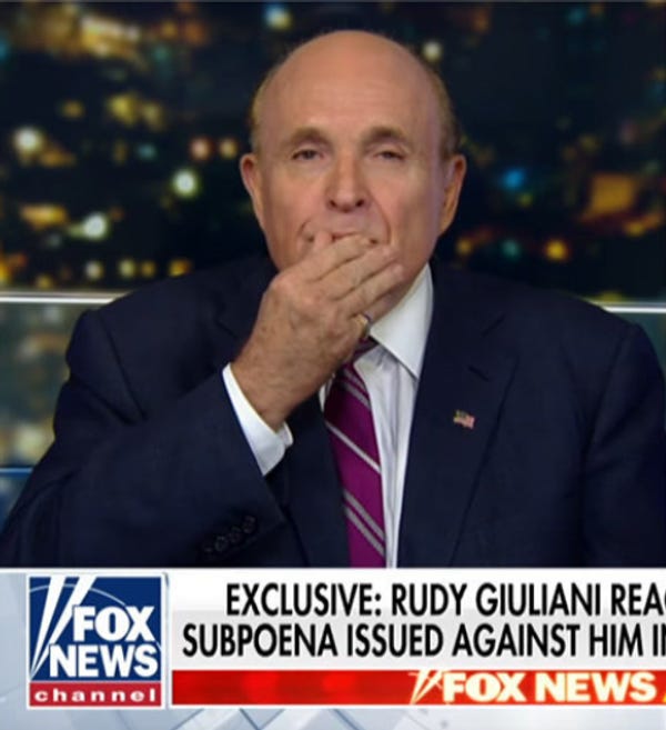 Giuliani, who is currently under investigation by his former colleagues in the Southern District of New York for possible violation of campaign finance laws and the Foreign Agents Registration Act (FARA) for his work with shadyass Ukrainians, is kicking it up another notch. This time he'll be conspiring on camera! No doubt he'll still claim attorney-client privilege for the conversations, since everything he does serves only to prove that Trump is totally innocent and Joe Biden is the real collusion. Because Rudy's A MAVERICK. Or a lunatic, definitely one of the two.