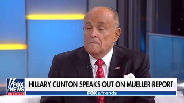 Giuliani, of course, has been making the rounds ever since the redacted and incomplete Mueller Report was released by Attorney General GopherMouth McCoverUp, declaring victory for Trump for all Fox News viewers who will definitely get around to reading it for themselves as soon as "Wheel Of Fortune" is over. The report shows conclusively (without Mueller actually making an official determination) that Donald Trump criminally obstructed justice approximately ONE-THOUSAND ELEVENTY times, in order to fuck with the lawful investigation into whether he or his campaign illegally conspired with Russia to steal the election. And though Mueller "did not establish" a specific criminal conspiracy he could indict, he found ONE-THOUSAND ELEVENTY gross and weird and likely compromising connections between Trump people and Russians, he found the Trump campaign had foreknowledge of the WikiLeaks email releases and planned campaign strategy around them, and he found that Paul Manafort the entire time was passing internal Trump polling to a Russian spy to give to a Russian oligarch, and we don't know exactly why because Manafort lied and because he concealed and destroyed evidence, HEY RUDY GIULIANI, WHAT WERE YOU SAYING ABOUT HILLARY CLINTON AGAIN?