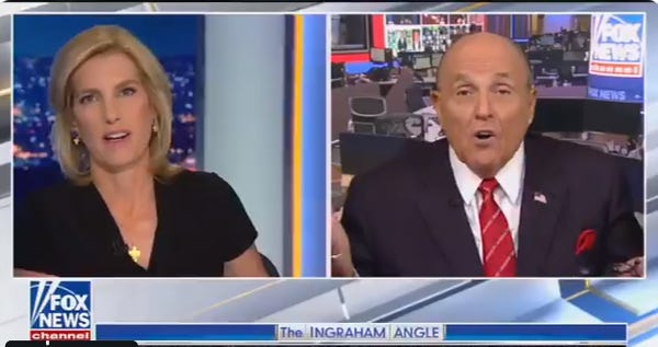 If you were on Twitter last night, you might have noticed that Roodles went on the Laura Ingraham show, and it was hoo boy. Whereas we were just hearing in that Times interview that Rudy simply told Trump and Pompeo what he knew ("knew"), and that he thinks maybe that contributed to their decision to fire Marie Yovanovitch to get her out of Rudy's way, on Ingraham he simply says "I forced her out," DAMN RIGHT HE FORCED HER OUT!