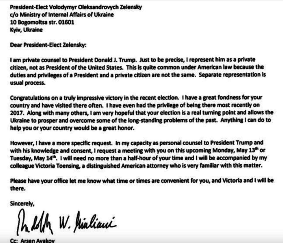Would this May 10 letter to then-President Elect Zelenskyy requestiong meeting "In my capacity as personal counsel to President Trump and with his knowledge and consent" to discuss a "specific request" do it for you? Because that would establish beyond a shadow of a doubt that Giuliani was NOT representing the interests of the United States when he went over there to lean on Zelenskyy to investigate Joe Biden.