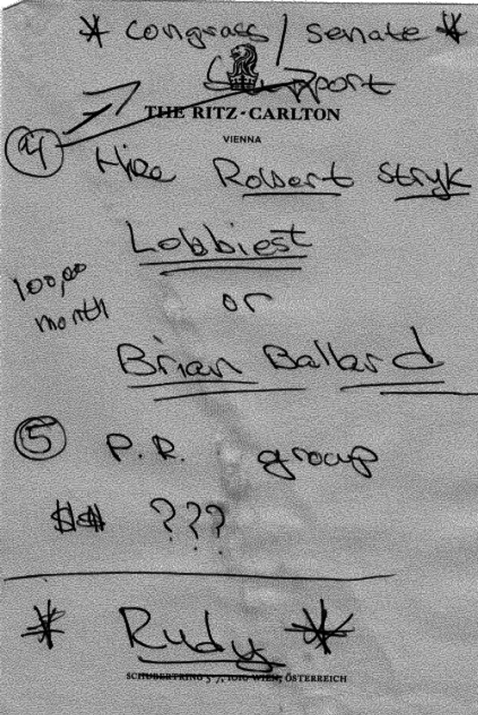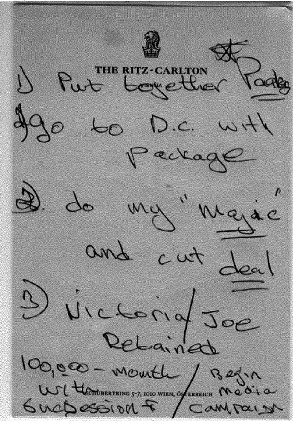 So you're going to assemble a "package" of dirt on Joe Biden to bring to DC so you can "cut deal." And the disheveled hairball lawyers Victoria Toensing and Joe diGenova are getting paid $100,000/month. You forgot to write "with that hacky disgrace John Solomon " after "Begin media campaign," but those hotel notepads are pretty small. Hey, can you just make sure to write down exactly who was bankrolling this whole endeavor?