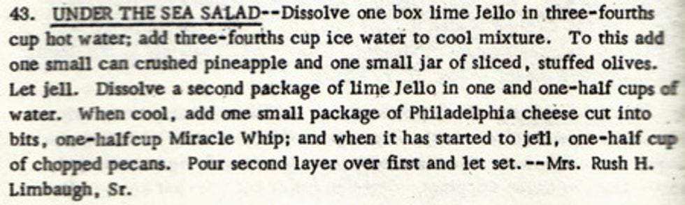 That, Wonkados, is what a young Rush Limbaugh ate for a treat: jello with pineapple and stuffed olives. AND MIRACLE WHIP ON TOP. Not Cool Whip -- that lovely fake whipped cream in a tub -- but Miracle Whip, the mayonnaise blended with salad dressing.