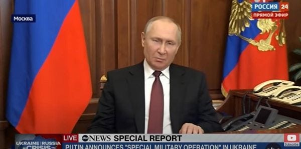 Late last night in America, the breaking news alerts took over the news stations, and early this morning in Ukraine, the sirens started blaring. Vladimir Putin had given the order for the real invasion of Ukraine. In the shocker of the century, it turns out Putin's not just interested in "protecting" a couple of pro-Russian provinces on the east side of the country, and he's not interested in "peacekeeping." He's going straight for the capital of Kyiv. Early explosions also were heard in the cities of Odessa and Kharkiv and we don't know where else. It's moving fast.