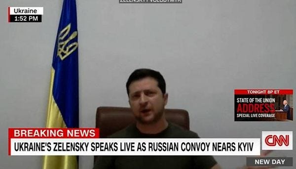 Here is Ukrainian President Volodymyr Zelenskyy addressing the European parliament this morning, while the English translator gets emotional, as that enormous Russian convoy hangs out outside the capital, Kyiv — a senior US official says it's "stalled" — and in the aftermath of the Russian bombing of the central square of Kharkiv, an attack many are saying was just an absolute war crime.