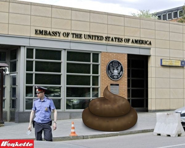 Look, we just wanted to make some jokes about pooping on the rug and speculating that maybe the SVR had recruited prize-winning journalist Chuck C. Johnson. But a lot of this crap isn't funny. Except for the crap crap. We simply wanted to stick to saying it's a good thing the carpet pooping didn't happen outside on the front porch in the winter, because no diplomat should have to try to defuse a Russian icy BM. Is that too much to ask?