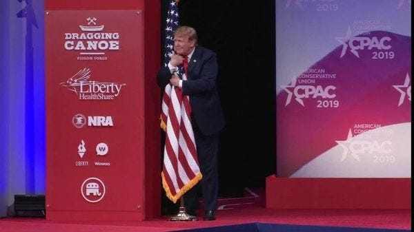 As he shuffled onto the stage, he took a moment to aggressively hug the American flag. He didn't ask, he just just went for it.