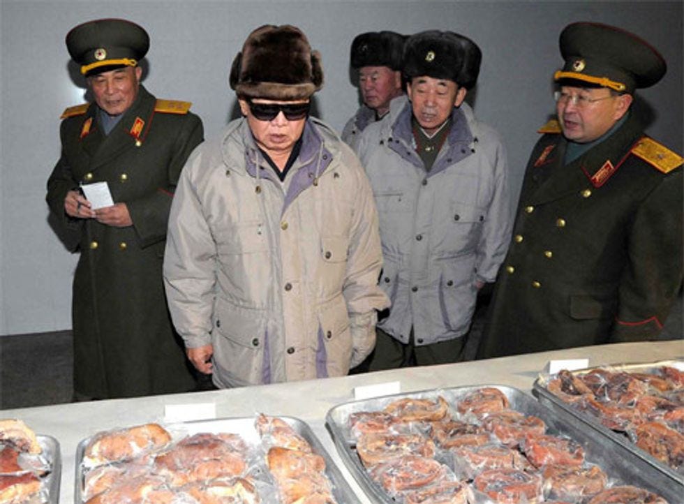 Just as millions of decent people around the world were marking the death of revolutionary Czech philosopher/playwright (and former president) Vaclav Havel with the realization that it is very rare to actually mourn a public figure's death, North Korean clown-monster Kim Jong Il kicked the bucket, and the world found it could laugh again. What next, Jane Goodall followed by Michael Vick? The Dalai Lama followed by Dick Cheney? Will this ceaseless parade of political-celebrity deaths end with Santa Claus himself ... followed immediately by the double-penetration suicide of the Koch Brothers?