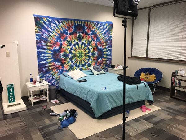 Well, who wouldn't be shocked to find a fake dorm room slapped together in a random office! What kind of drug-addled fiend would park a teenager in a conference room? You know they're just going to use that foam tile ceiling as a dart board. But please, carry on, fellow kids.
