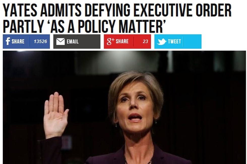 The real winner for stretching in that exchange is Dead Breitbart's Home For Rightwing Screaming, which seized on a minor part of Yates's reply to Cornyn. Unconstitutional? Unlawful? Forget it -- when Cornyn accused her of not defending Muslim Ban I because she disagreed on the order as a "policy matter," Yates prefaced her discussion of the order's legality by saying "it was not purely as a policy matter,” so Dead Breitbart yelled GOTCHA! and made that the headline: