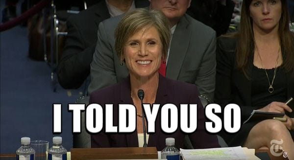 Sally Yates went (back) to Washington to tell Congress how she was "You're Fired" by Trump for saying mean things about Mike Flynn and Russia.