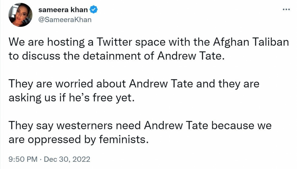 Now, former Miss New Jersey US and self-described "anti-woke" journalist Sameera Khan is citing the Taliban as a moral authority when it comes to the matter of recent Muslim convert Andrew Tate. Khan, who was previously fired from Russian news organization RT America for her praise of Stalin's gulags, has been an outspoken admirer of Tate for some time now. On Friday evening, she decided to host a "space" on Twitter with "the Taliban," whom she explained were very concerned about Tate being arrested.