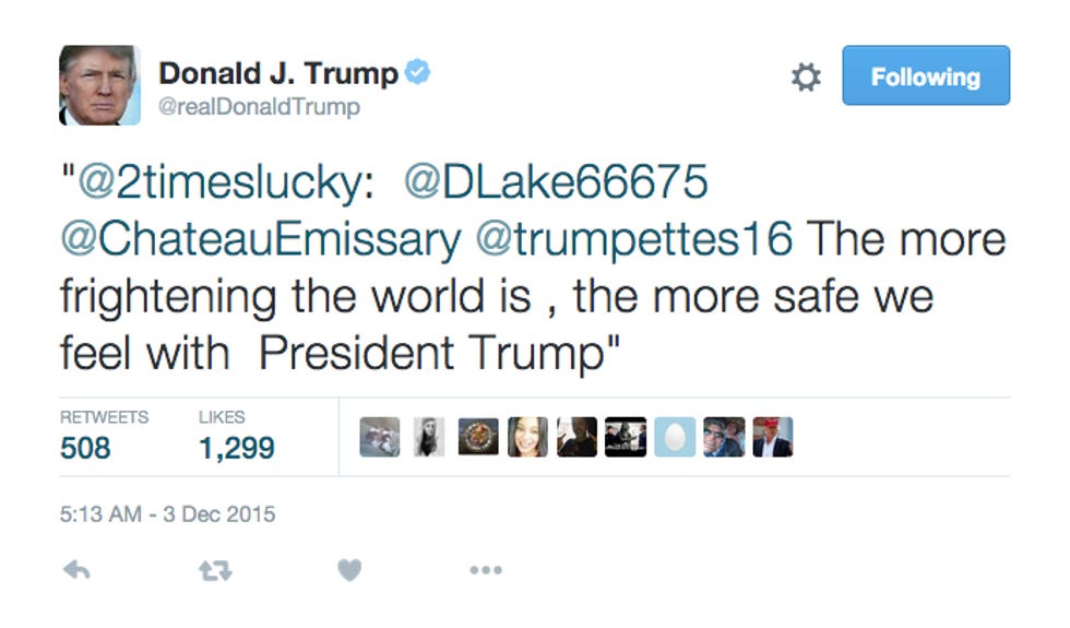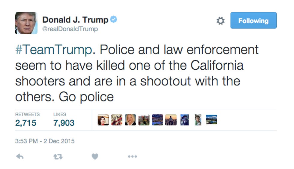 Another mass shooting happened in America, because Wednesday, and while Donald Trump, like his fellow Republican presidential candidates, was at first reserved in his response -- "California shooting looks very bad," he tweeted , failing to offer the obligatory "thoughts and prayers" -- his thoughts evolved throughout the day, to the real focus of the horrific story: Team Trump.