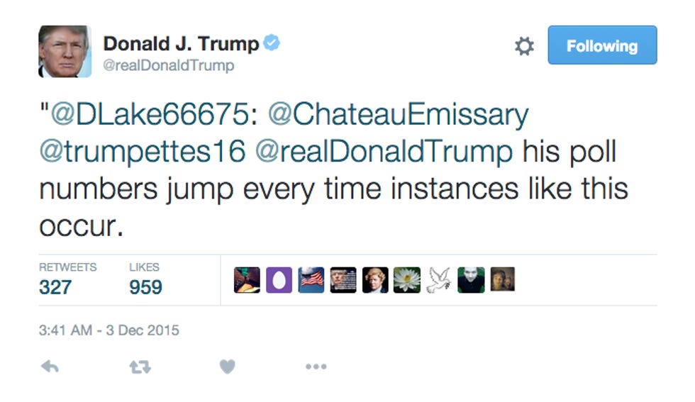 We also won't waste our pixelated breaths asking if Trump seemingly crowing about how the murder of 14 people will at least give him a bump in the polls -- he's quite fond of bragging about his poll numbers, you know -- suggests Trump has no sense of decency, sir. We believe that question has long ago been asked and answered.