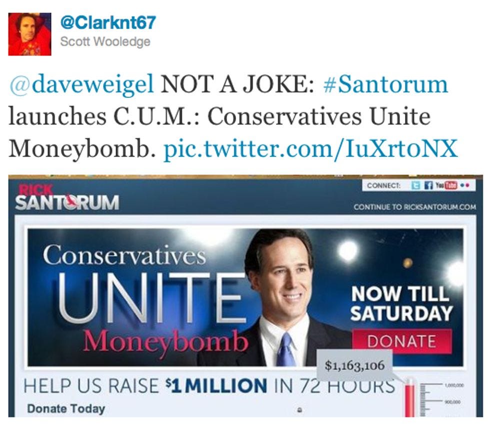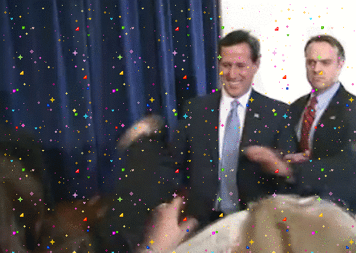 Rick Santorum's wild weekend in South Carolina started with a fundraising campaign called, excellently, the Conservatives Unite Moneybomb (C.U.M.), and ended with a second-to-worst-place finish and what was essentially a rambling plea for a robot/muffin to take him in their arms and make him their running mate. In the end, the C.U.M. didn't have enough of an impact to impress South Carolina voters, and then Santorum "fans" unleashed a bomb of their own while the candidate was signing autographs post-primary results: GLITTER.