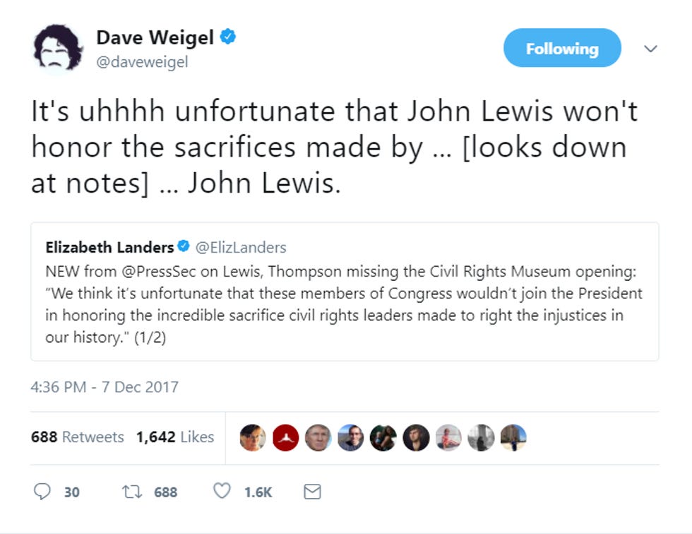 In case you didn't know, Donald Trump, racial uniter, is going to Jackson, Mississippi, this weekend for the opening of the Mississippi Civil Rights Museum, because SOMEBODY with their head up their ass (Mississippi wingnut Governor Phil Bryant) thought that was a good idea. People are pissed, because it's an insult to the entire struggle for civil rights for Donald Trump, a white supremacist who thinks some of the Charlottesville Nazis fighting to save Confederate traitor statues were lovely people, to be anywhere NEAR such an event. The NAACP is pissed. Local organizers are pissed. (We, a Southern white man who lives not far away, are pissed.) And Civil Rights hero Congressman John Lewis is pissed too! He and Rep. Bennie Thompson are in fact so pissed that they've decided to skip the event entirely.
