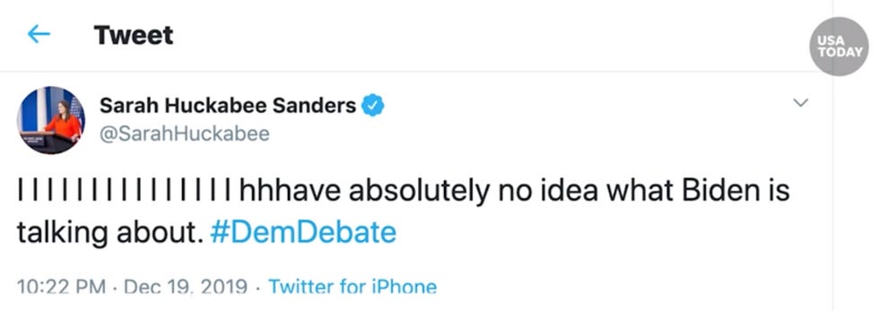 Part-time White House press secretary Stephanie Grisham is so grossly incompetent, you forget that her predecessor Sarah Huckabee Sanders was so competently gross. She reminded us of how terrible a person she is last night during the slimmed-down and gentrified Democratic debate. Sanders, presumably watching from her evil lair, let frontrunner Joe Biden have it about his un-American socialist speech impediment.
