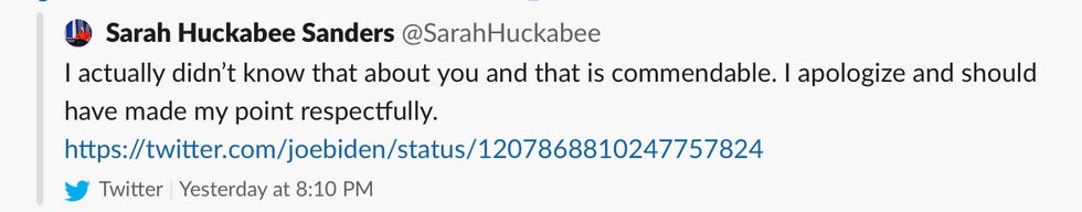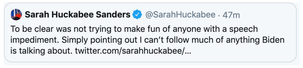 Biden delivered a surprise speech to the American Institute for Stuttering in June 2016. This was around the time Sanders's former boss, Donald Trump, was mocking disabled reporters. Sanders isn't stupid. She took her shot at Biden and when he stood up to her, she ran and hid. That's what bullies do.