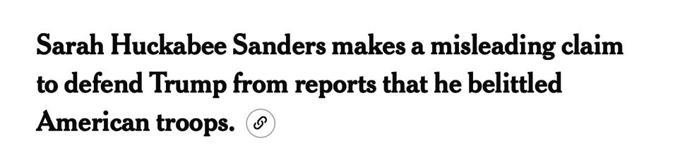 Fortunately, military families don't have to rely on Trump to inform them of their loss. Otherwise, he'd leave them wondering why their kids stopped writing home. Sanders's lies are so easily disproven she must really think we're dumb. Granted, she's used to crossing swords with a press that still gives her the benefit of the doubt. Note this Times headline: