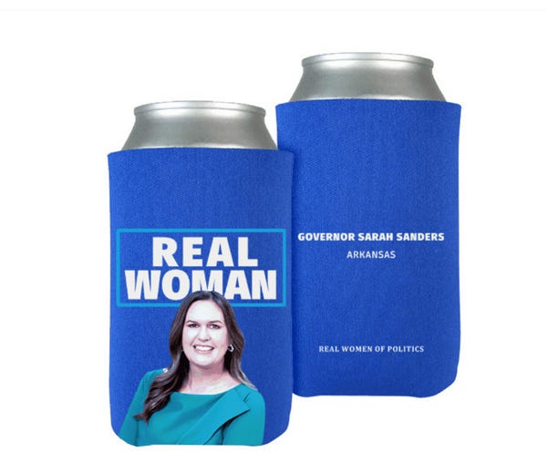 So, this is not a joke. Sarah Huckabee Sanders is marketing koozies that say "real woman," and you can get them with her face on them. Or Kay Ivey's face. Or Kristi Noem or Kim Reynolds. Because the theme here is "real women of politics," and it is women governors who are also filthy garbage anti-LGBTQ+ bigots.