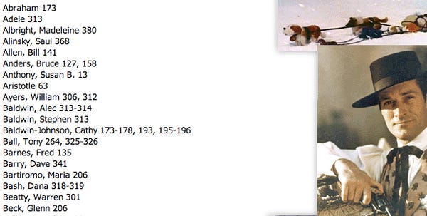 Oh good morning. Sleeping, we were? Perhaps spending time with family and friends? Those things do NOT sound like "thinking about Sarah Palin," which means that for many of you, it has been two, even three hours since you have thought about Sarah Palin. Ha, hey look someone made a Going Rogue index and then uploaded it next to some JPGs of soldiers and cowboys! Well done . Since this same person also embedded a song terrible beyond all comprehension on the website, here are the interesting—Mick Jagger! "Issac," the protagonist of Stephenie Meyer's Bible series! Stapleton!—index terms, aggregated right here on your silent Wonkette.