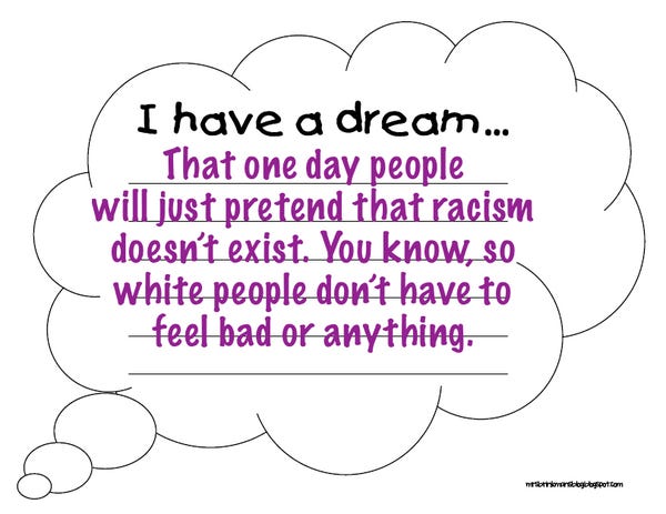 Yes, if there was anything Martin Luther King hated , it was black people acting like racism exists instead of just going along and letting white people pretend everything is OK the way it is. His dream, as it were, was simply for black people to stop annoying nice white ladies like Sarah Palin with their incessant complaints of "OH! The police are killing us!" and whatnot. After all, it was Martin Luther King himself who acknowledged that racism didn't exist at all (except against white people), because the Declaration of Independence -- which was written when black people were still slaves -- said "all men are created equal." He also, as we all know, told black people to always check with conservative white people prior to declaring something racist, as they could not possibly be able to determine that themselves. It was also he who implored black people to not complain about white people saying and doing racist things, until they themselves were 100% perfect.