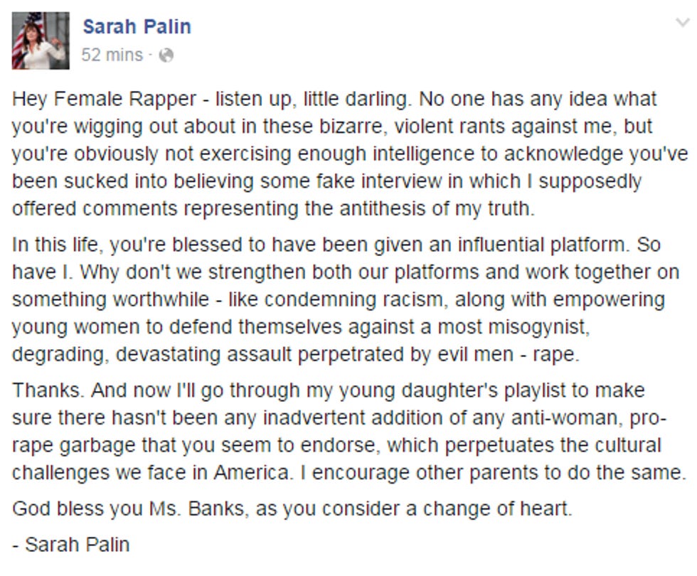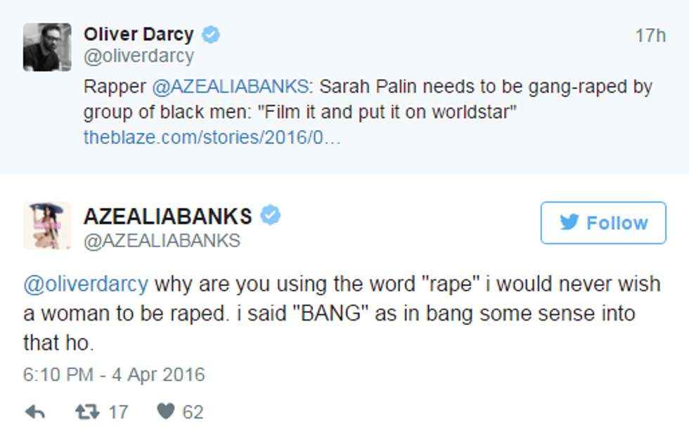 But Sarah is right about a thing this one time! You see, rapper lady Azealia Banks went on a Twitter rant, now deleted, about how it would be a good idea for a gang of large black men with large black dicks to rape Sarah Palin. That's an absolutely terrible thing to tweet! If you are Doing Sexuals with large black dicks, it needs to be consensual, Official Wonkette Policy.