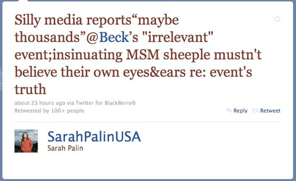 Oh look, Twitter, Sarah Palin is here to tell us that the media is being silly about her pal @beck's rally. What's that silly media? You say @beck is the Twitter handle not of Glenn Beck but of the multi-instrumentalist musicman Beck? Sounds like you're just relying on your eyes and ears again, like idiots.