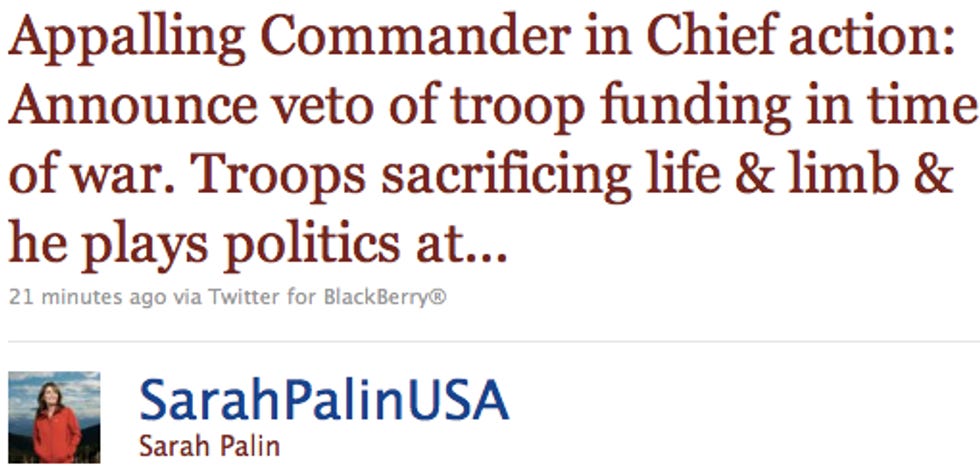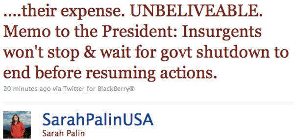 As we mentioned yesterday, troops will continue to earn pay during government shutdown, but they will not be able to receive paychecks while it's going on, and House Republicans used this to score political points. (I.e. they were the ones "playing politics," which is a funny phrase anyway, because everything politicians do is, by definition, politics.) That may seem pretty banal, but according to leading military squirmish analyst Sarah Palin, at the stroke of midnight, our troops' weapons will DISAPPEAR and will all immediately be killed by "insurgents" who will suddenly "resume actions."