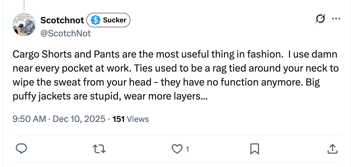 So in 15 years, and I’m like, from a fashion standpoint, I don’t think we’ve moved since 2000 in 25 years. If you showed someone a picture of ‘this is a bunch of, this is a bunch of dudes in 2000. This is a bunch of dudes in 2025.’ Which year is which? So, I think we should I don’t know, spice it up a little.