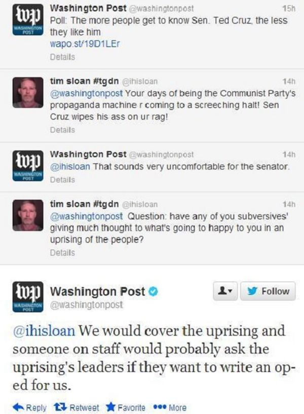 From the twittoverse, this lovely screenshot of a conversation between the Washington Post's Twitter person and a rather disgruntled fan of Ted Cruz. Hats off to whoever* is answering the trolls!