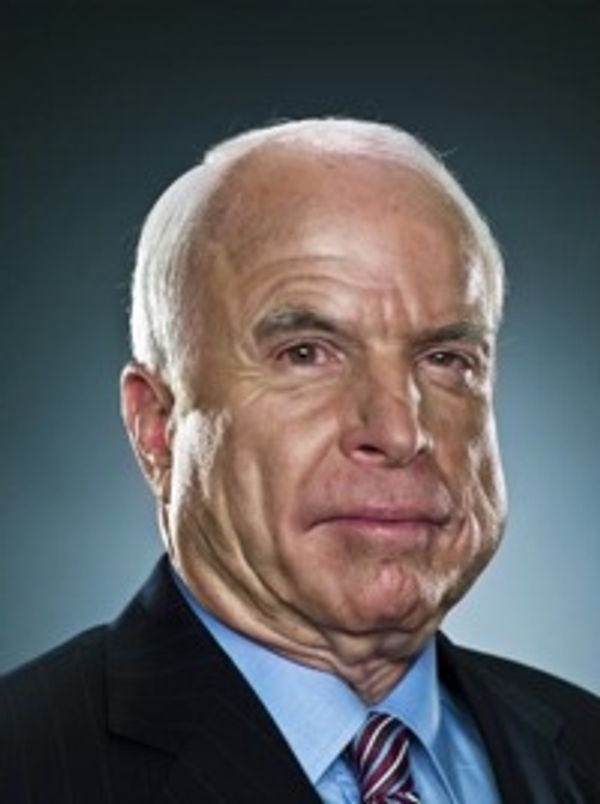 Jill Greenberg is that photographer who takes pictures of monkeys and crying babies all the time, which was why she seemed like a natural fit for John McCain'sAtlanticcover. But it turns out she is a big fat libtard, so she tricked John McCain into various unflattering positions during his photo shoot -- including making him sit under the head of a pooping monkey. Ha ha we kid, she accomplished that feat with Photoshop, which was still not up to the task of making John McCain look like a human in his "flattering" cover photo. Anyway click here (note: banner ads above some images are for NSFW type sites) for more outtakes that are making the people who hired her for this shoot all kinds of mad. Photo via Imagebam. [ New York Post ]