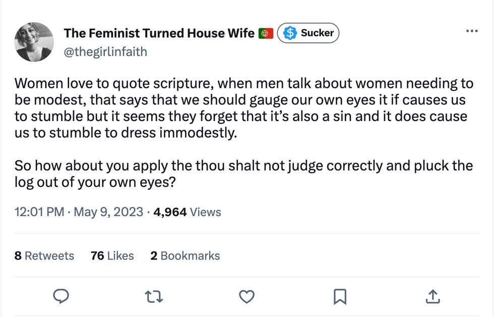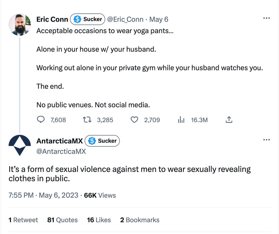 I've been through many seasons of this, but it honestly feels more widespread now than ever before — especially when it comes to women participating in the discourse. Though, to be fair, many of those are actually anti-feminist men pretending to be anti-feminist women in order to make it seem like there are more anti-feminist women out there preaching about the evils of yoga pants than there actually are. And they usually slip.