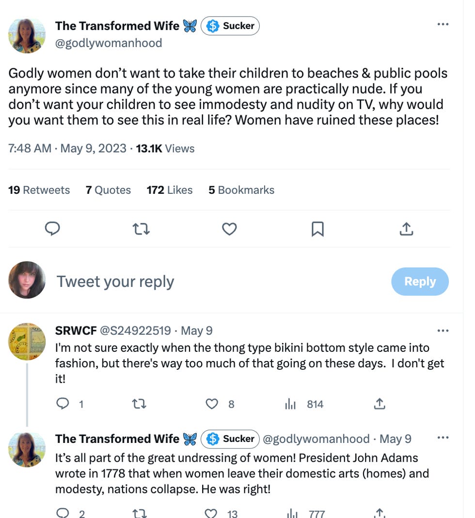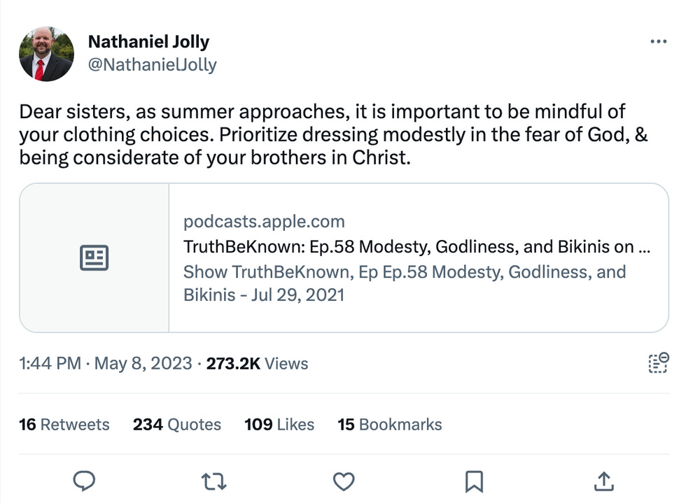 The fact is, the FLDS didn't pop up out of nowhere. Purity culture didn't pop up out of nowhere. I'd love to be able to say that this choir director or these red pill creeps are aberrations who also popped up out of nowhere, but versions of them have always existed. There have always been men who have sought to police women's ability to express themselves sexually and sartorially, because they want to be able to control women and if you want to control people — that's the way to do it.