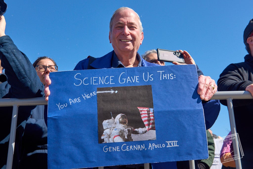 Lloyd Franklin, 64, stood at the front of the stage wearing a blue NASA jacket. He is a retired aerospace engineer who, like many kids, grew up wanting to be an astronaut. He held a sign with a photo of Apollo astronaut Gene Cernan from 1972. Cernan is taking a selfie while holding the American flag as the Earth, a pale blue dot, floats in over his shoulder. It was the last time humans walked on the Moon.